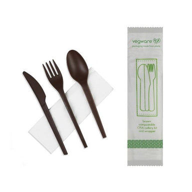 Brown CPLA cutlery kit from our Veridian™ range. Comprising of: knife, fork, spoon and napkin. Great for hot or cold, and sturdy and strong enough ...