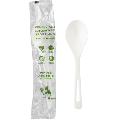 World Centric® compostable 6" wrapped soup spoons are made from PLA (polymer made from plants) and Talc (mineral filler). These utensils are certif...