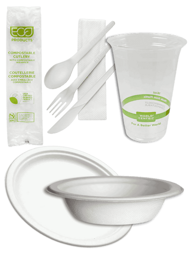 If you're having an event, you've come to the right place - this kit has 50 plates, 50 hot cups, and 50 sets of cutlery all in one! ___ Compostable...
