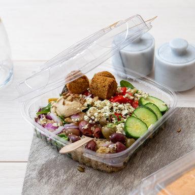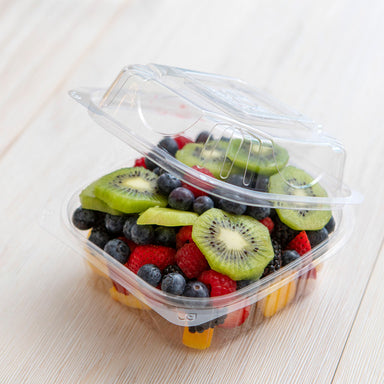 Sustainable clear clamshell containers made from renewable plant-based materials, perfect for cold foods, salads, fruits, and takeout meals. Suppor...