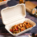 A 9 x 6in molded fiber clamshell. For cold or hot food - street food, fried rice, salads, or even sweet treats. Made from reclaimed natural fiber, a material with great thermal properties. White. Award-winning quality by Vegware, made from plants. Designed for industrial composting.