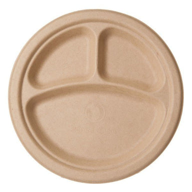 10in 3-compartment molded fiber plate. Great for hot soups, side, oatmeal or desserts, or cold salads or snacks. Made from reclaimed natural fiber,...